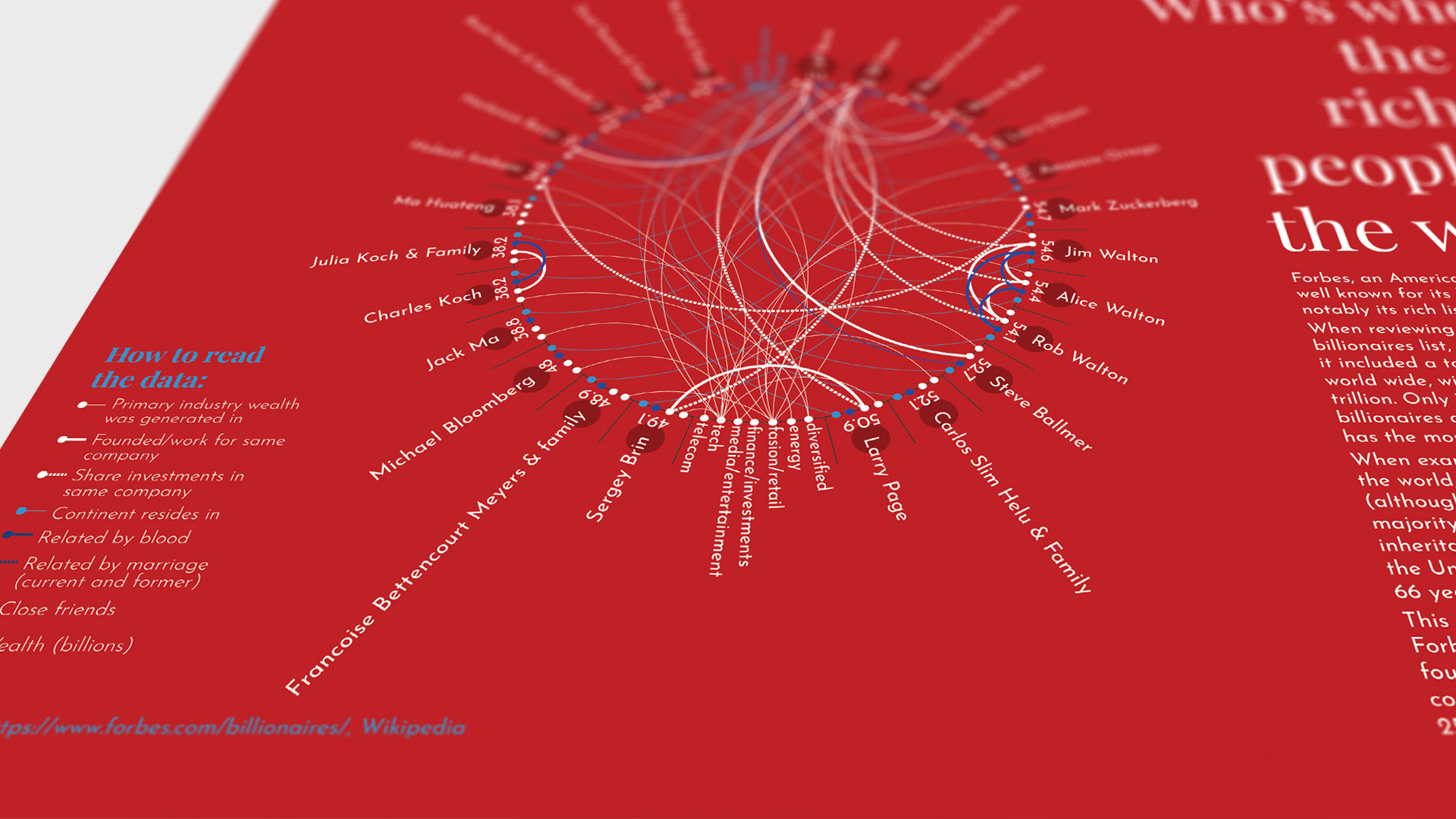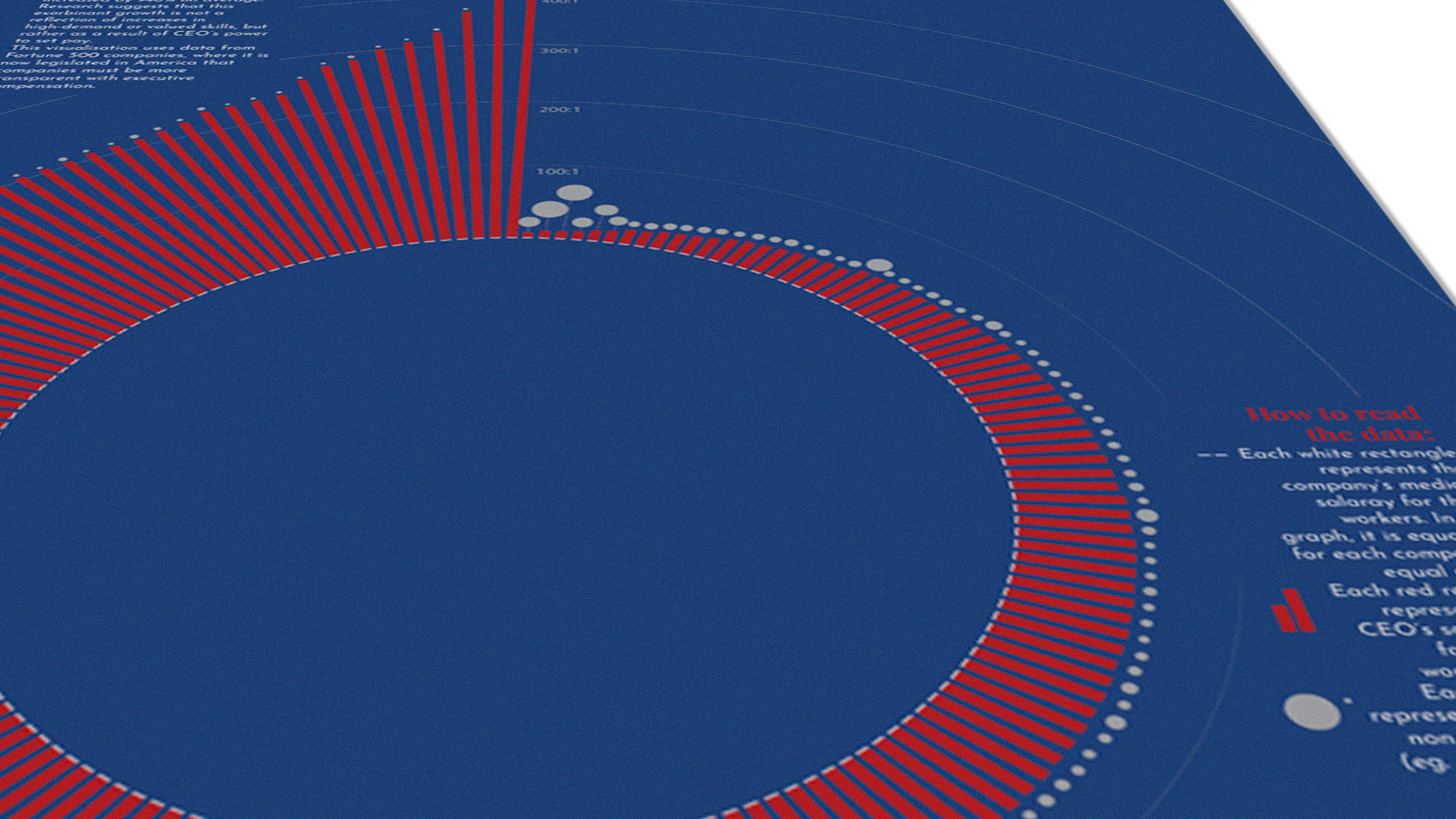 The core elements of the project are three data visualisations (click links for full-res versions). The first visualisation shows the gender pay gap that exists in Australia. Inspired by the span chart style, scale of the data points was also used to portray the split in the labour force between males and females. The second visualisation uses a chord diagram to draw connections between the 25 richest people in the world. Colour and stroke width help to differentiate between the different types of relationships and commonalities. The third visualisation uses a radial bar chart to reveal the ratio between CEO salaries and the median worker salary of Fortune500 companies. Scaled circles also show how much more CEOs received in non-salaried benefits.