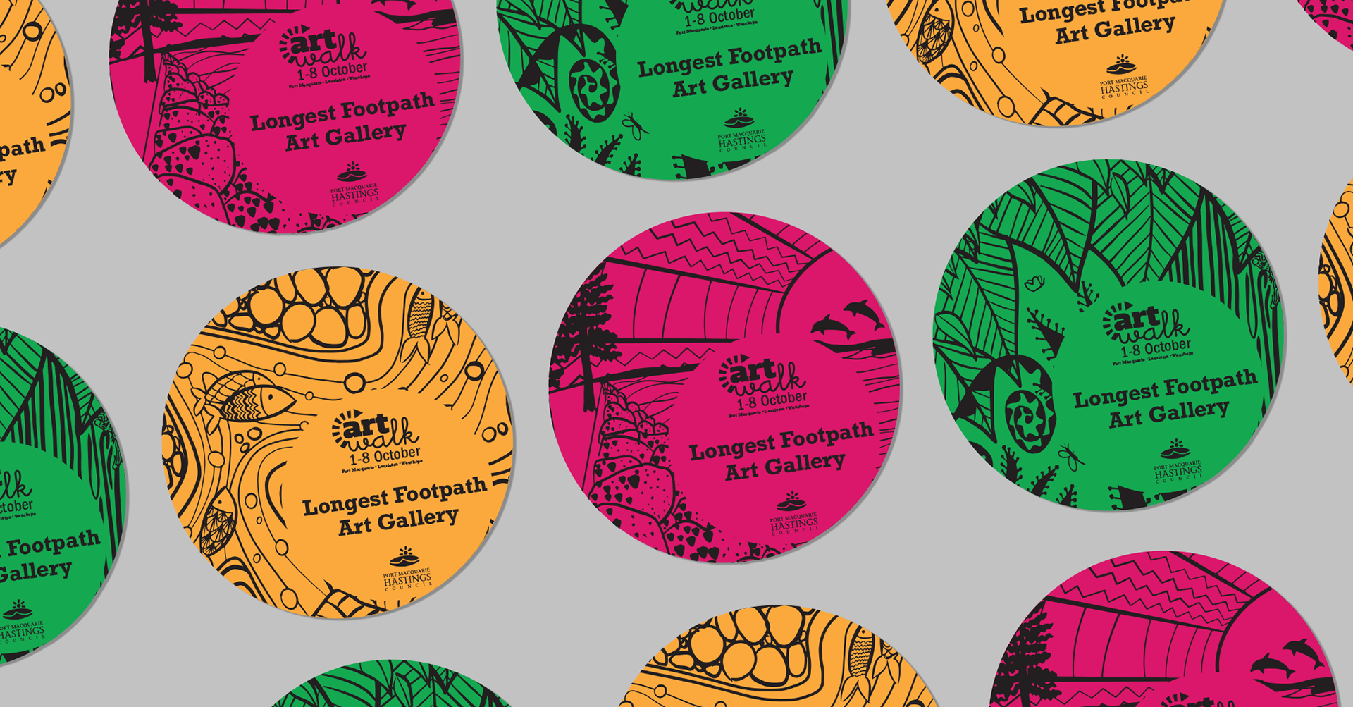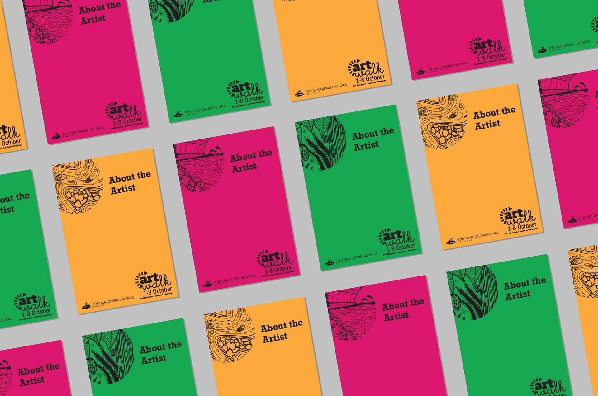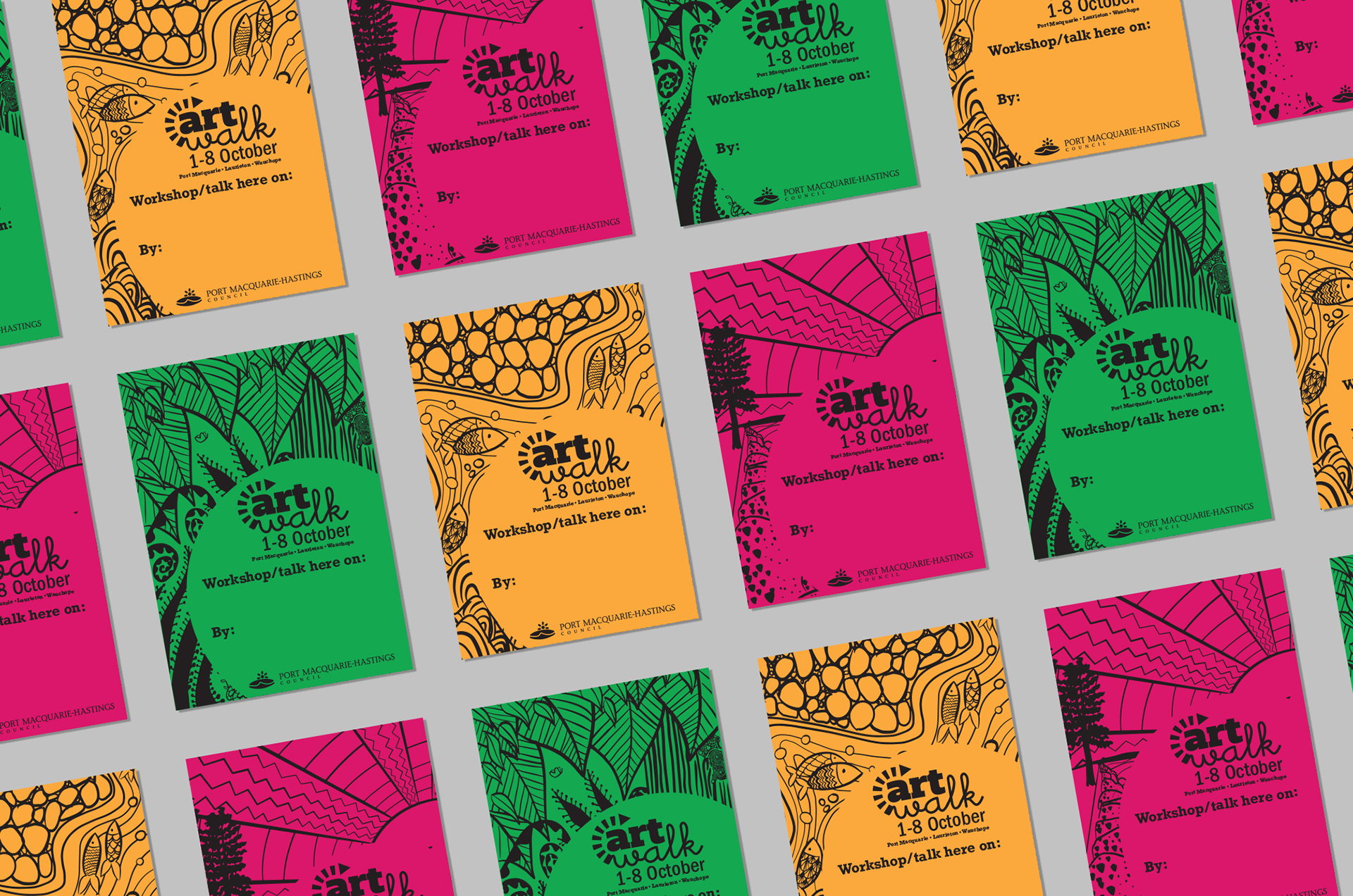 As ArtWalk 2020 was going to be spread over 3 CBD locations (Port Macquarie, Laurieton and Wauchope), I wanted the visual identity to reflect this. Each suite featured a different colour and illustration that draws on themes and features that the town is well known for, tied together by the same use of monocolour illustrative style, and the same layout to each piece of collateral.